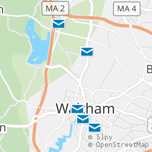 All 5 locations in Waltham, Massachusetts with operating hours, phone numbers, and postal services around Middlesex County.