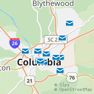 All 12 locations in Columbia, South Carolina with operating hours, phone numbers, and postal services around Richland County.