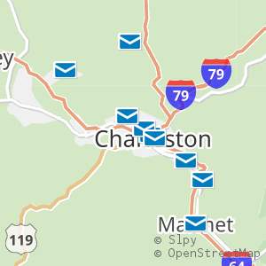 All 9 locations in Charleston, West Virginia with operating hours, phone numbers, and postal services around Kanawha County.